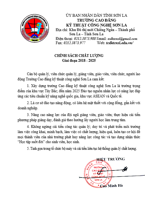 Chính sách chất lượng của Trường Cao đẳng Kỹ thuật công nghệ Sơn La