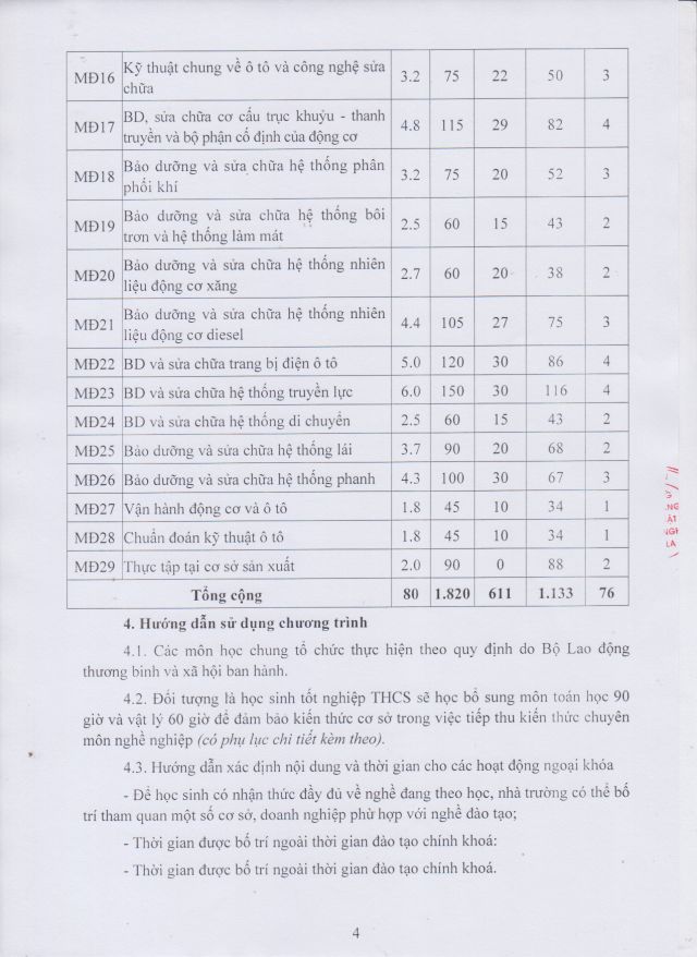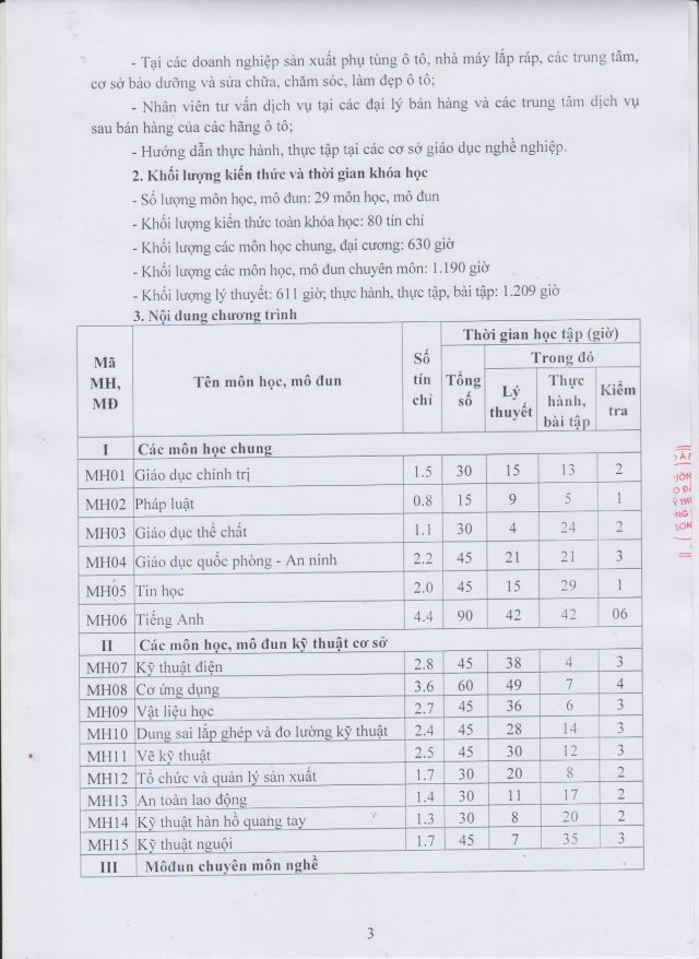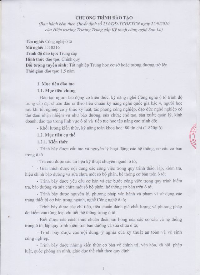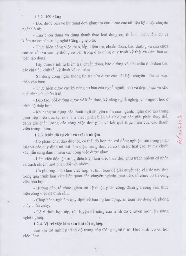 Chương trình đào tạo Trung cấp, nghề Công nghệ ô tô