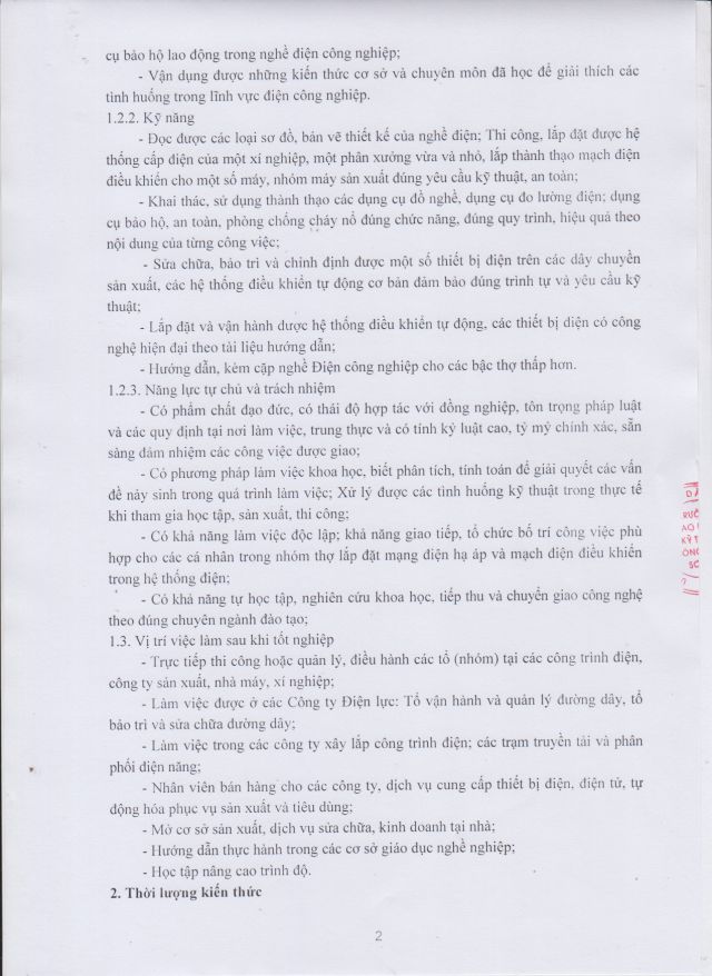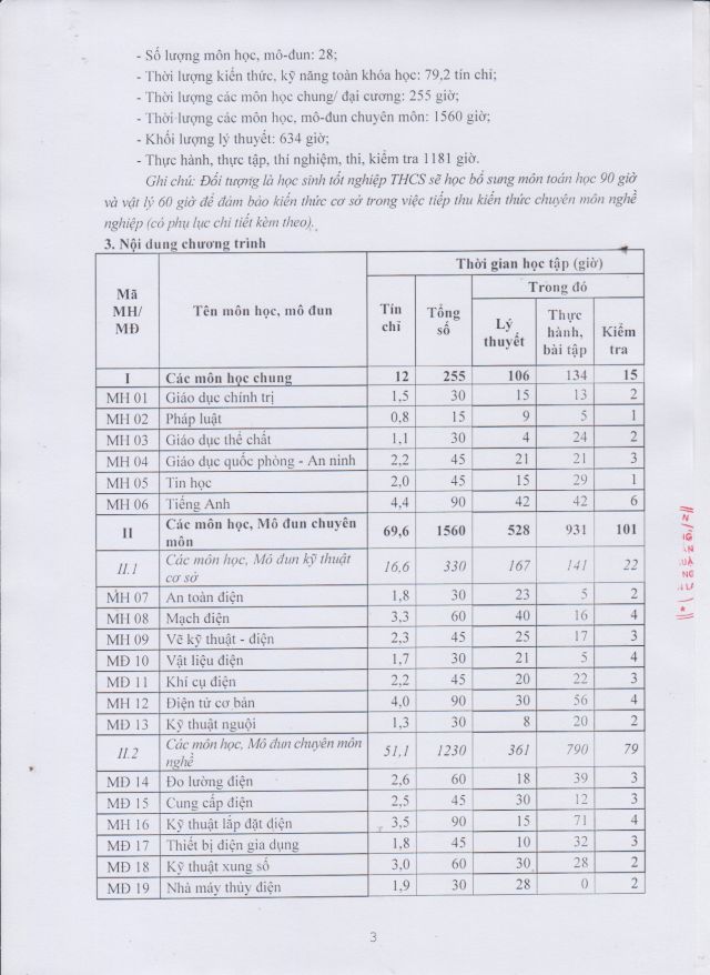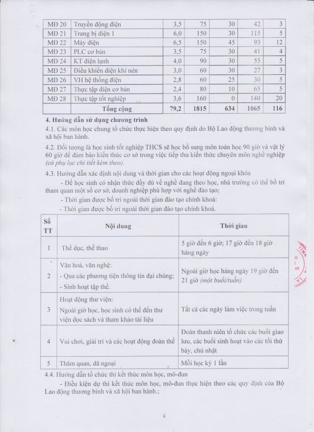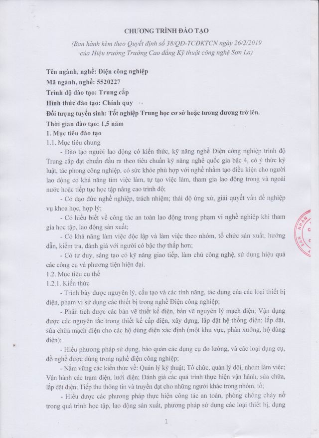 Chương trình đào tạo Trung cấp, nghề Điện công nghiệp