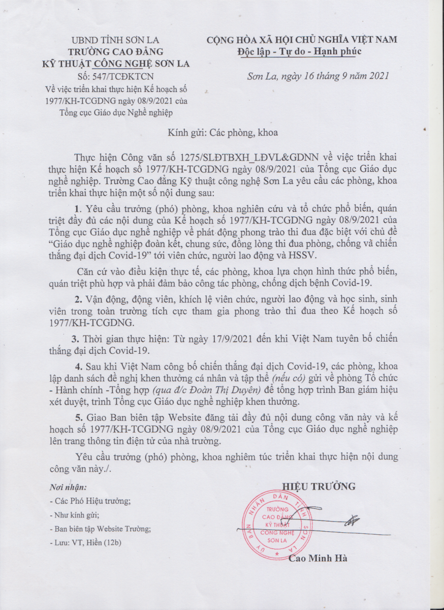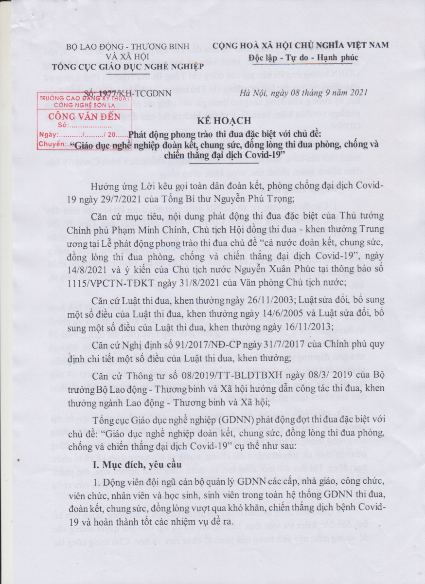 Công văn 547 triển khai thực hiện Kế hoạch số 1977/KH-TCGDNN ngày 08/9/2021 của Tổng Cục Giáo dục nghề nghiệp về việc phát động phong trào thi đua đặc biệt "Giáo dục nghề nghiệp đoàn kết, chung sức,