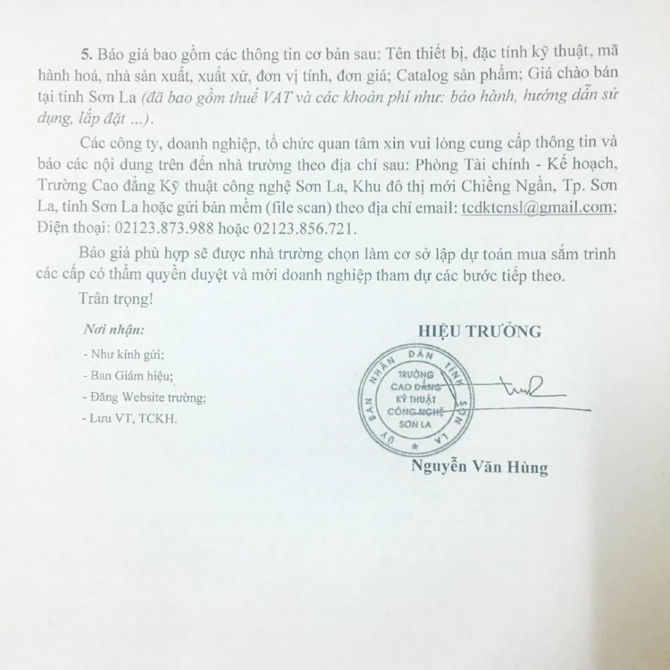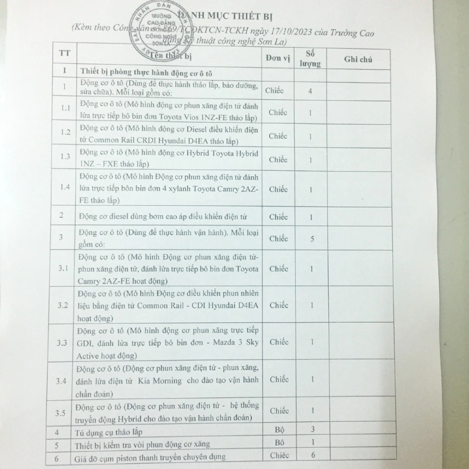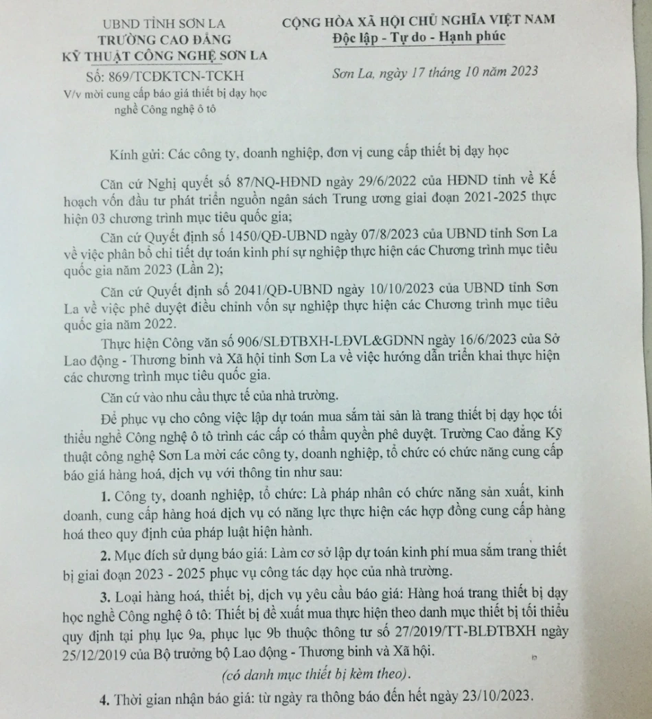 Công văn mời cung cấp báo giá thiết bị nghề công nghệ ô tô năm 2023