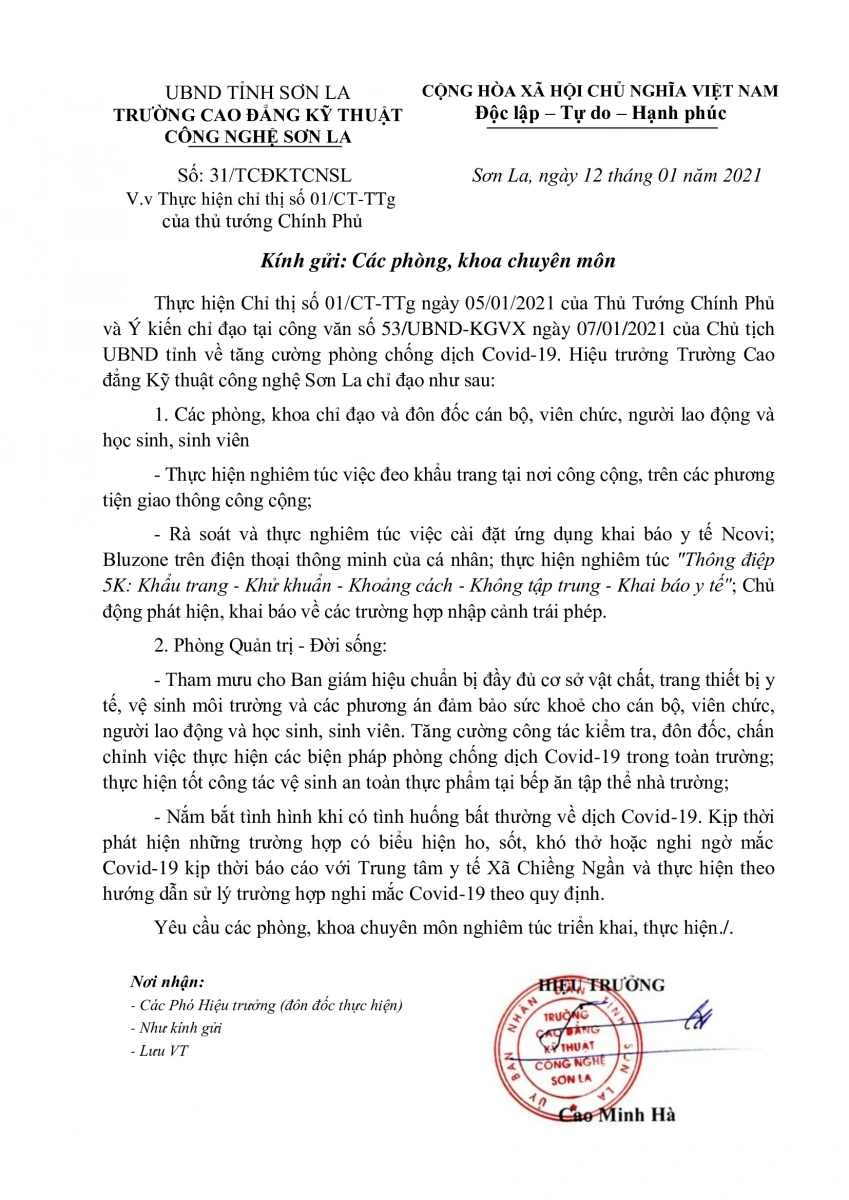 Công văn thực hiện chỉ thị 01/CT-TTg của Thủ Tướng Chính phủ về phòng chống dịch Covid-19