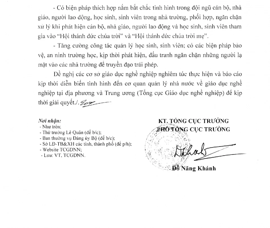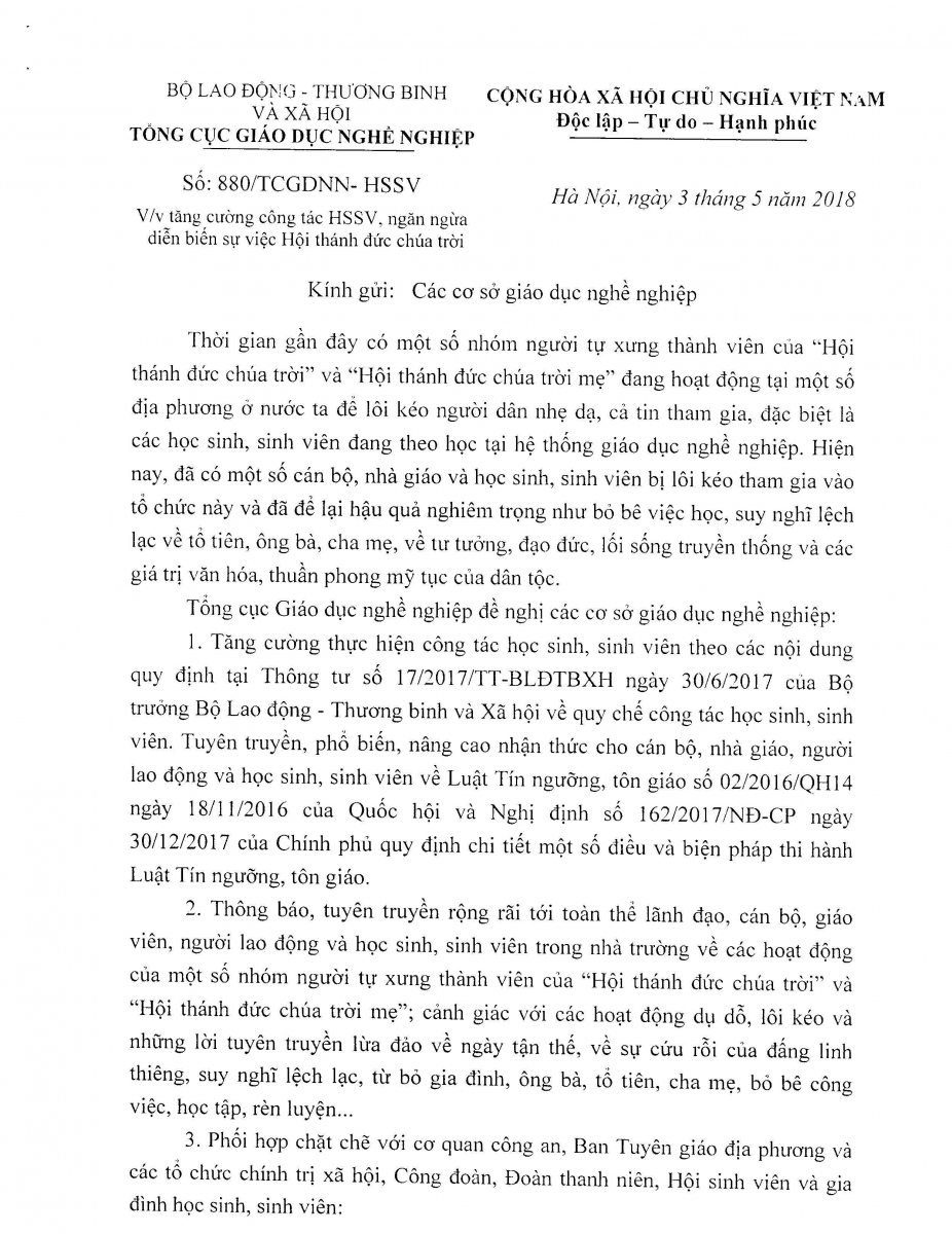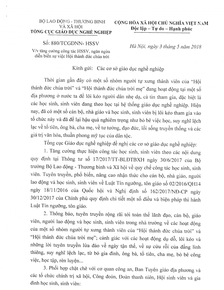 Công văn về việc tăng cường công tác HSSV, ngăn ngừa diễn biến sự việc Hội thánh đức chúa trời