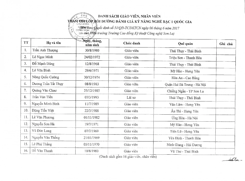 Danh sách giáo viên, nhân viên tham gia lớp bồi dưỡng đánh giá kỹ năng nghề bậc 1 năm 2017