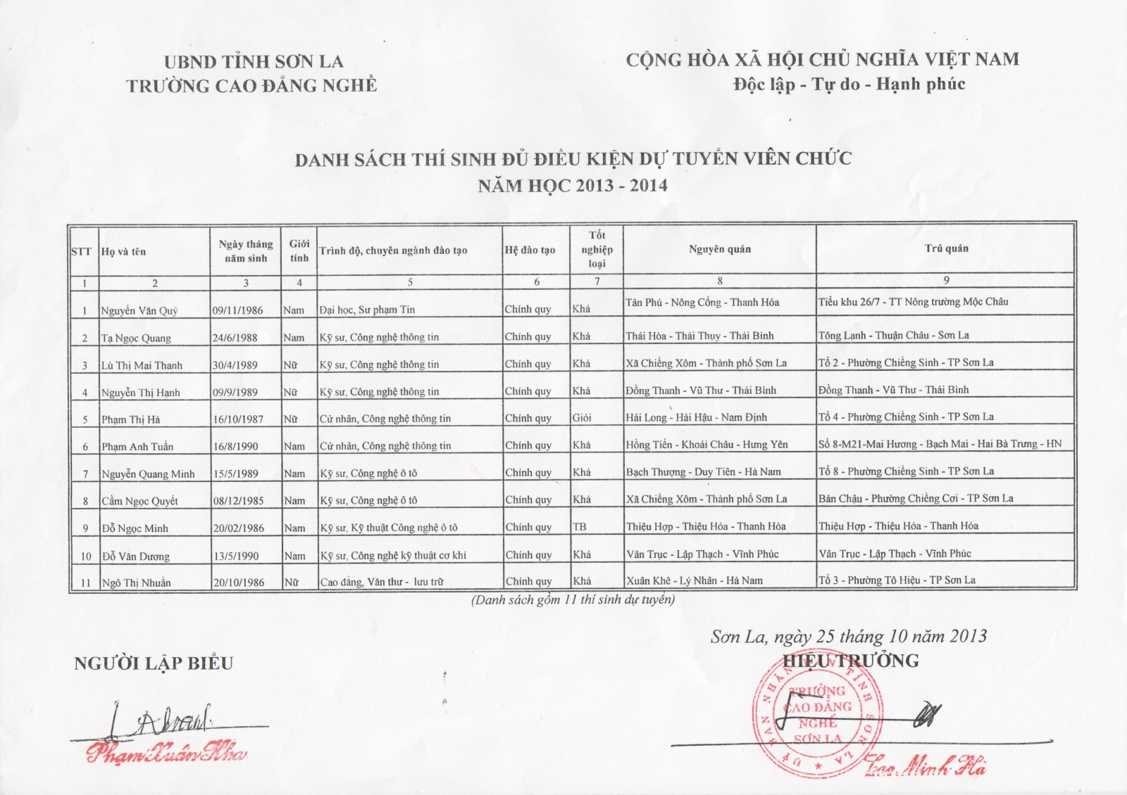 Danh sách thí sinh đủ điều kiện dự tuyển viên chức năm học 2013-2014