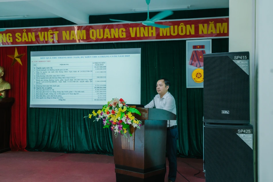 Đ/c Nguyễn Văn Hùng - Bí thư Đảng ủy, Hiệu trưởng thay mặt Nhà trường trìnhbày“Kết quả thực hiện nhiệm vụ năm học 2024 - 2025; phương hướng, nhiệm vụ năm học 2025 - 2026”