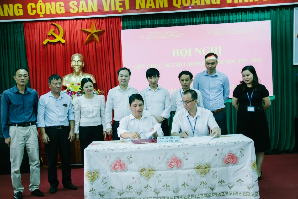 Tại hội nghị đồng chí Nguyễn Văn Hùng, Bí thư đảng ủy, Hiệu trưởng nhà trường đại diện chính quyền và đồng chí Vũ Khắc Khôi, Chủ tịch công đoàn đại diện công đoàn nhà trường đã ký giao ước thi đua năm học 2022 - 2023.