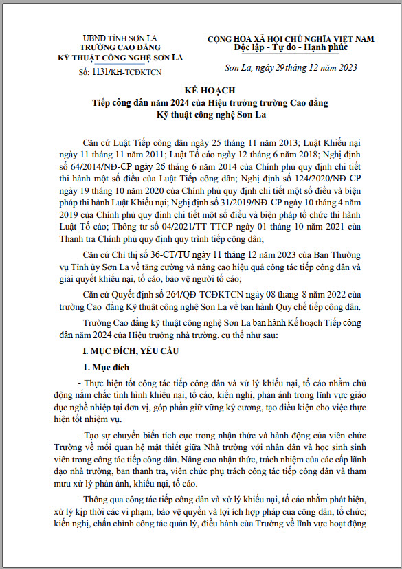 Kế hoạch 1131 tiếp công dân năm 2024 của Hiệu trưởng trường Cao đẳng Kỹ thuật công nghệ Sơn La