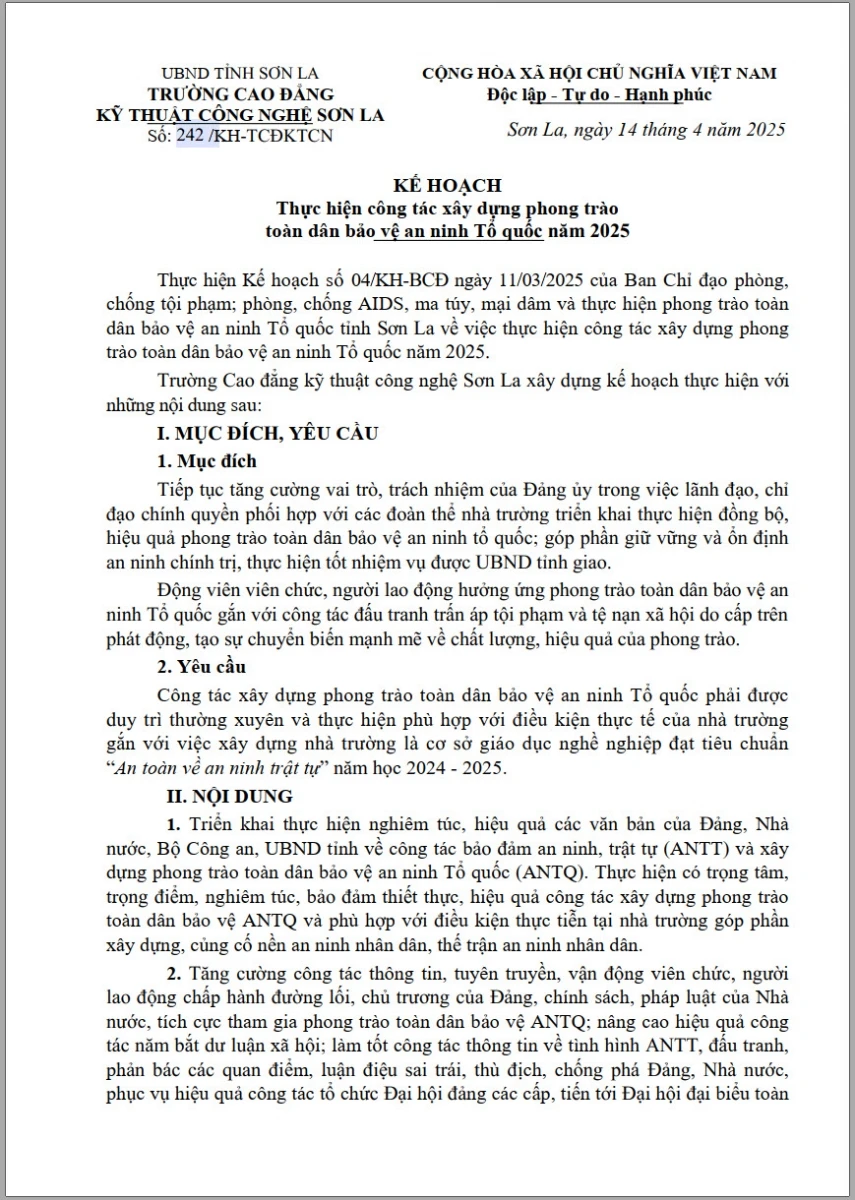 Kế hoạch 242 Thực hiện công tác xây dựng phong trào Toàn dân bảo vệ an ninh tổ quốc năm 2025