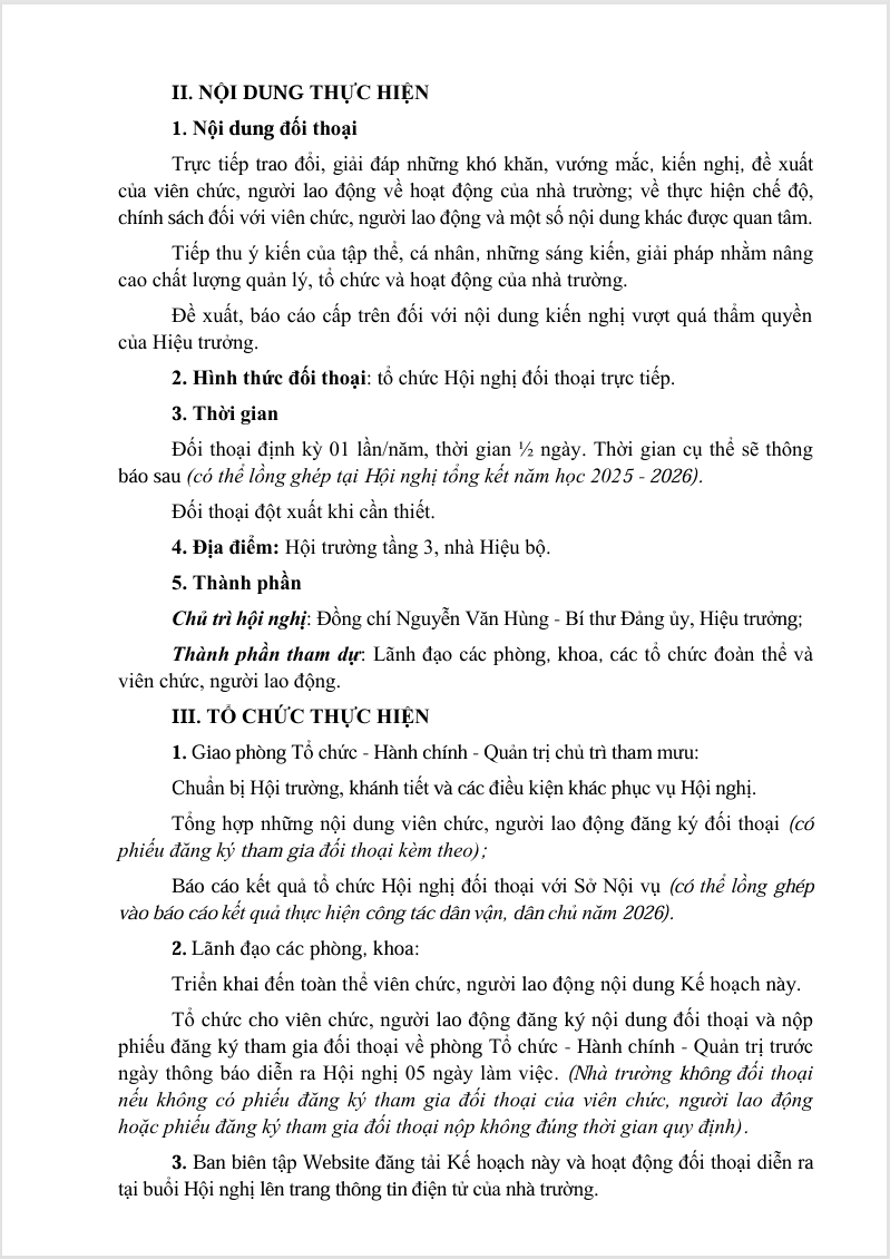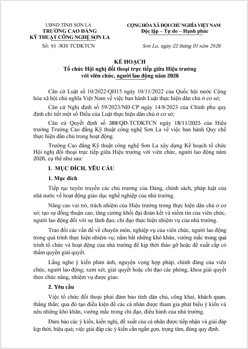 Kế hoạch 93 Tổ chức hội nghị đối thoại trực tiếp giữa Hiệu trưởng với viên chức, người lao động năm 2026