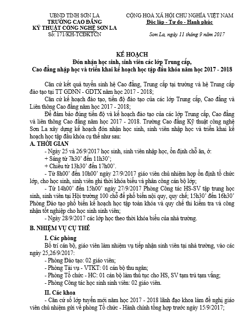 Kế hoạch đón nhận học sinh, sinh viên nhập học năm học 2017 - 2018