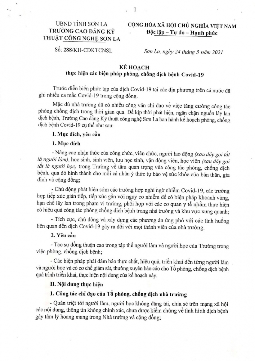 Kế hoạch số 288/KH-CĐKTCNSL ngày 24/5/2021 về việc thực hiện các biện pháp phòng, chống dịch bệnh Covid - 19