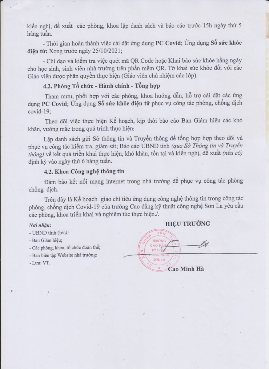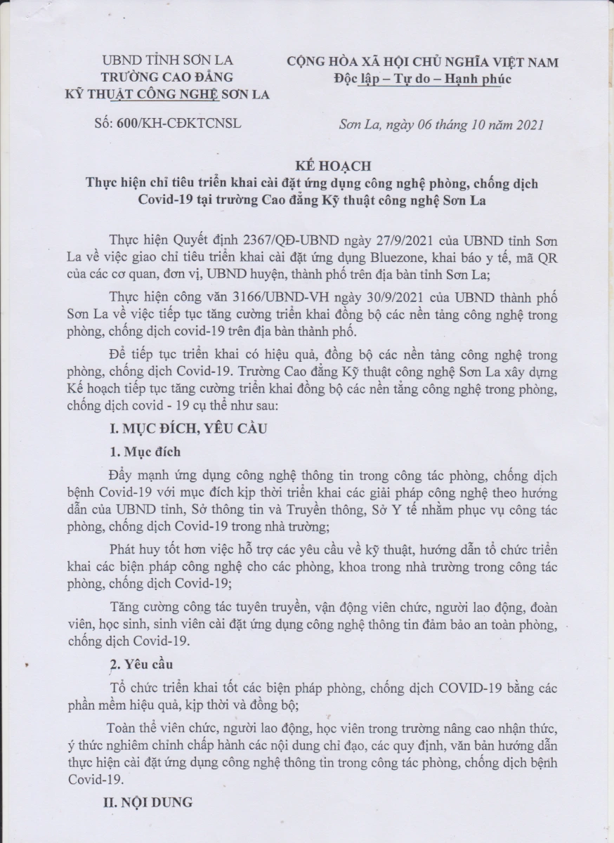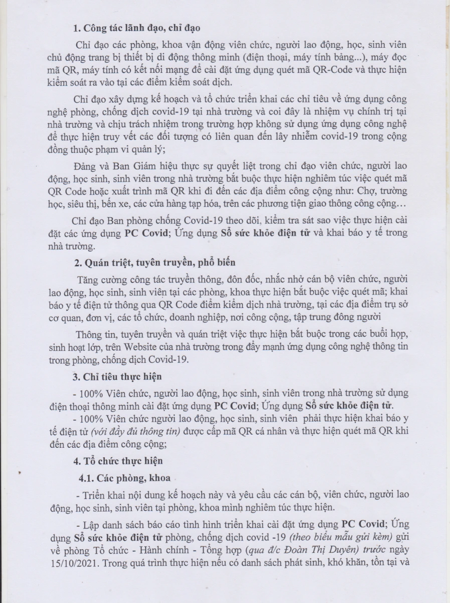 Kế hoạch số 600/KH-TCĐKTCN ngày 06/10/2021 về việc thực hiện chỉ tiêu triển khai cài đặt ứng dụng công nghệ phòng, công Covid - 19 tại trường