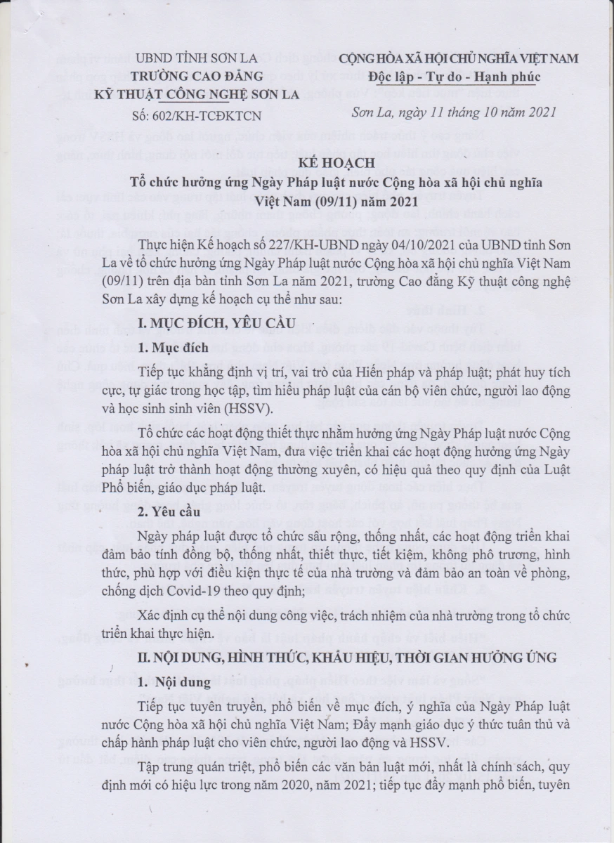Kế hoạch số 602/KH-TCĐKTCN ngày 11/10/2021 về việc hưởng ứng tổ chức ngày pháp luật nước Cộng hòa xã hội chủ nghĩa Việt Nam năm 2021