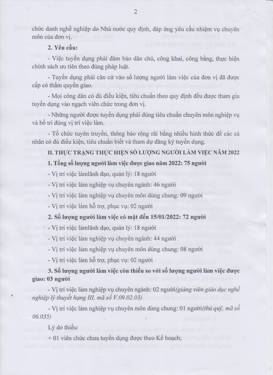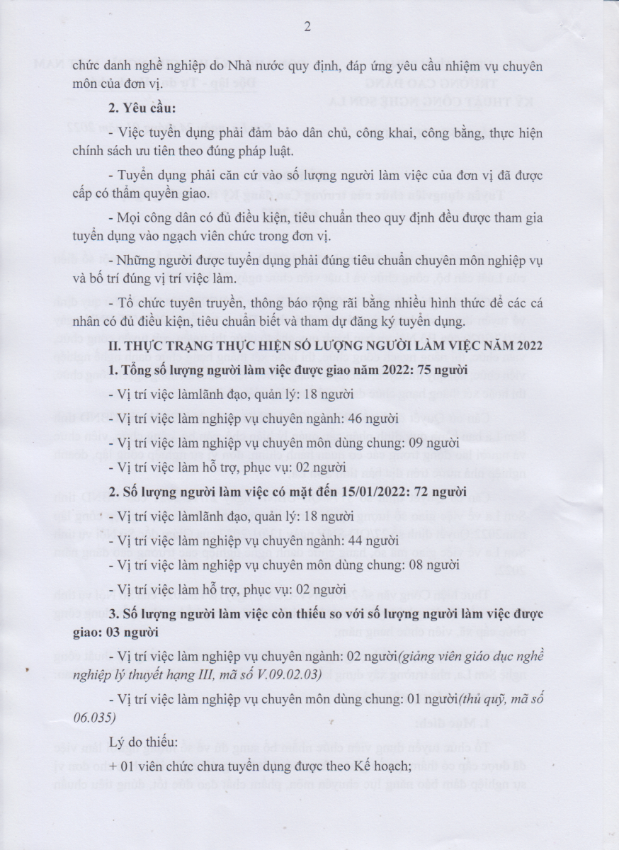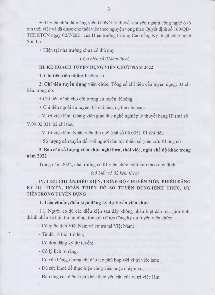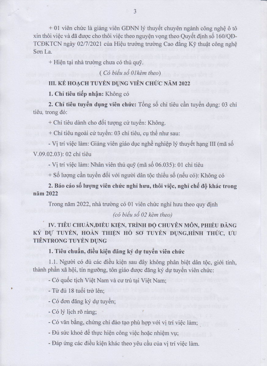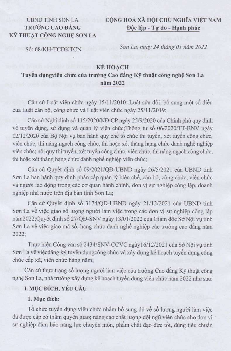Kế hoạch số 68/KH-TCĐKTCN ngày 24/01/2022 của Trường Cao đẳng kỹ thuật công nghệ Sơn La về việc tuyển dụng viên chức năm 2022