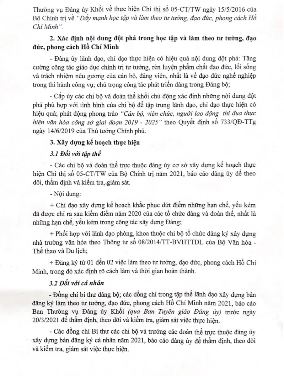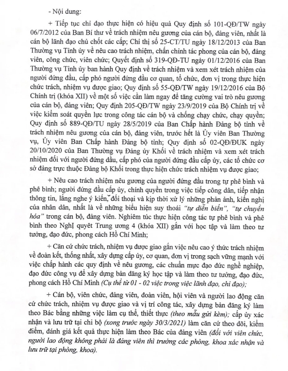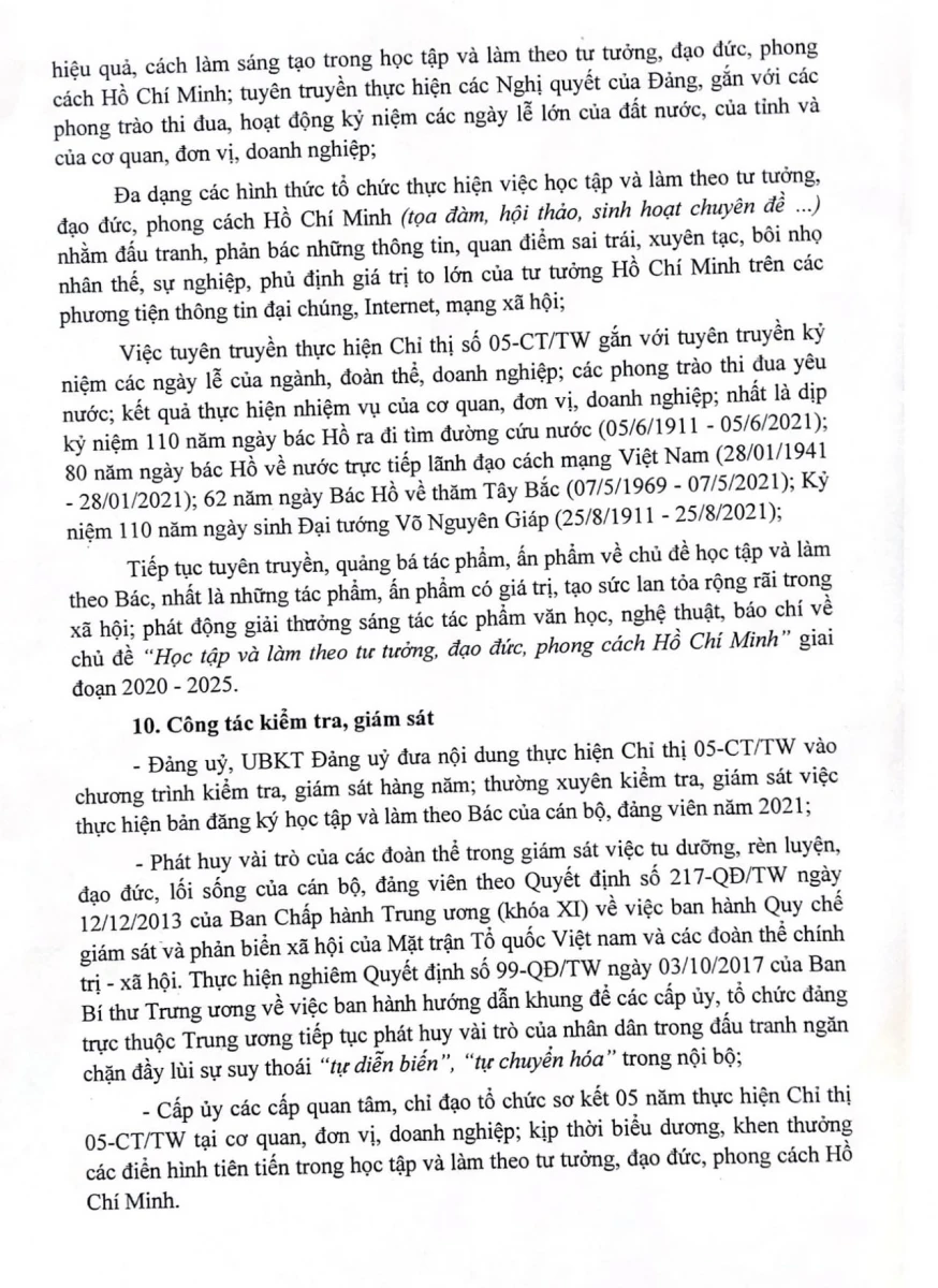 Thực hiện Chỉ thị 05-CT/TW ngày 15/5/2016 của Bộ Chính trị về "Đẩy mạnh học tập và làm theo tư tưởng, đạo đức, phong các Hồ Chí Minh" năm 2021.