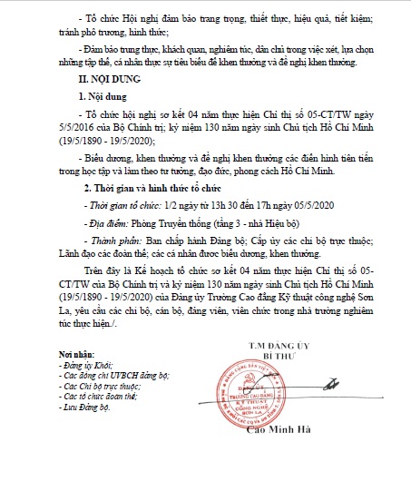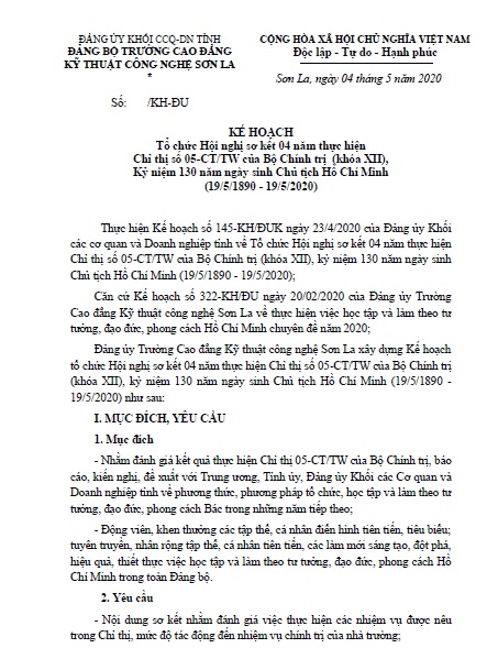 Kế hoạch tổ chức sơ kết 04 năm thực hiện Chỉ thị 05; kỷ niêm 130 năm ngày sinh Chủ tịch Hồ Chí Minh