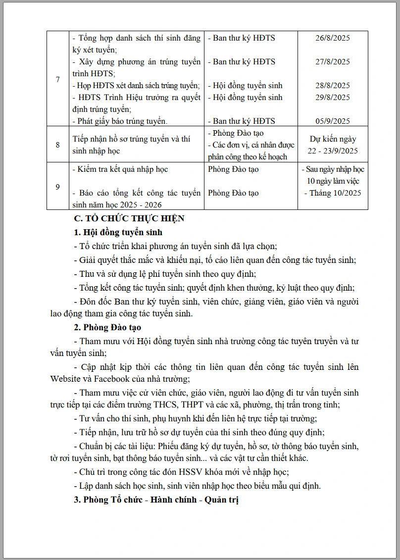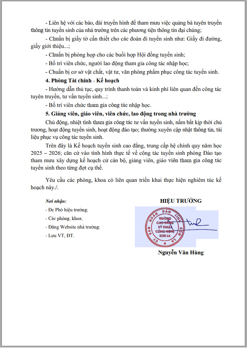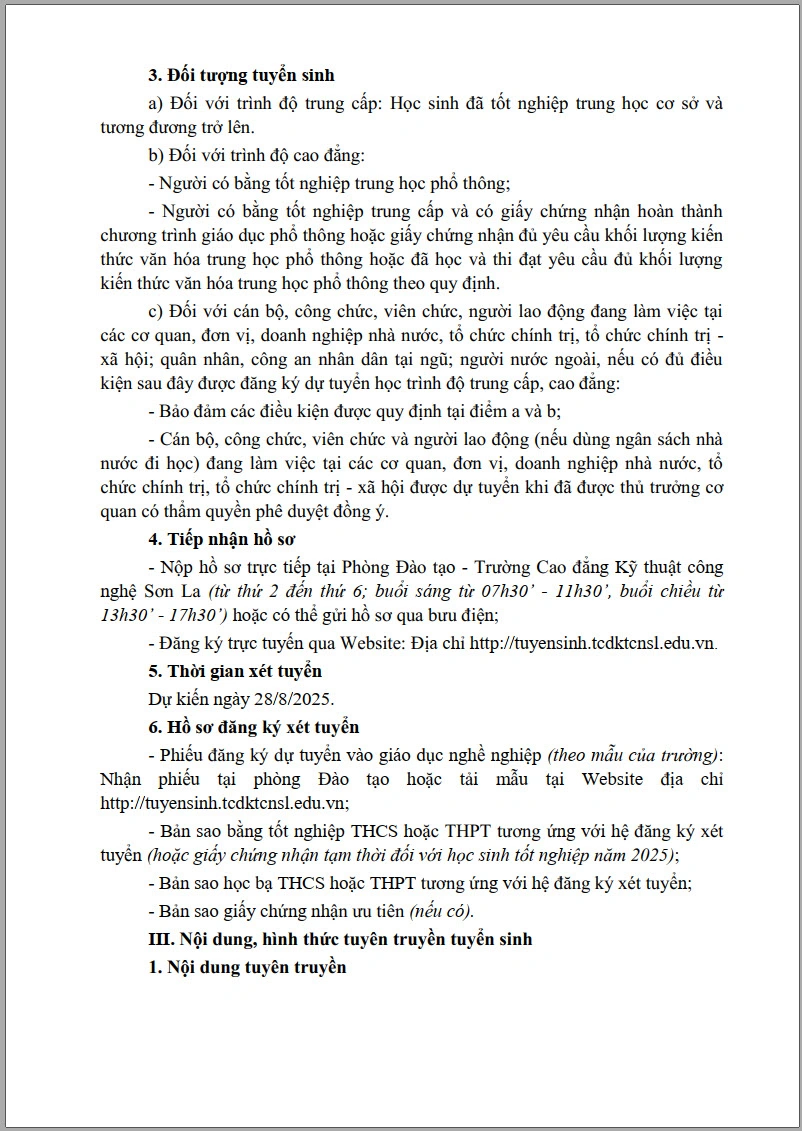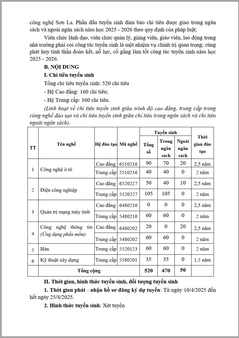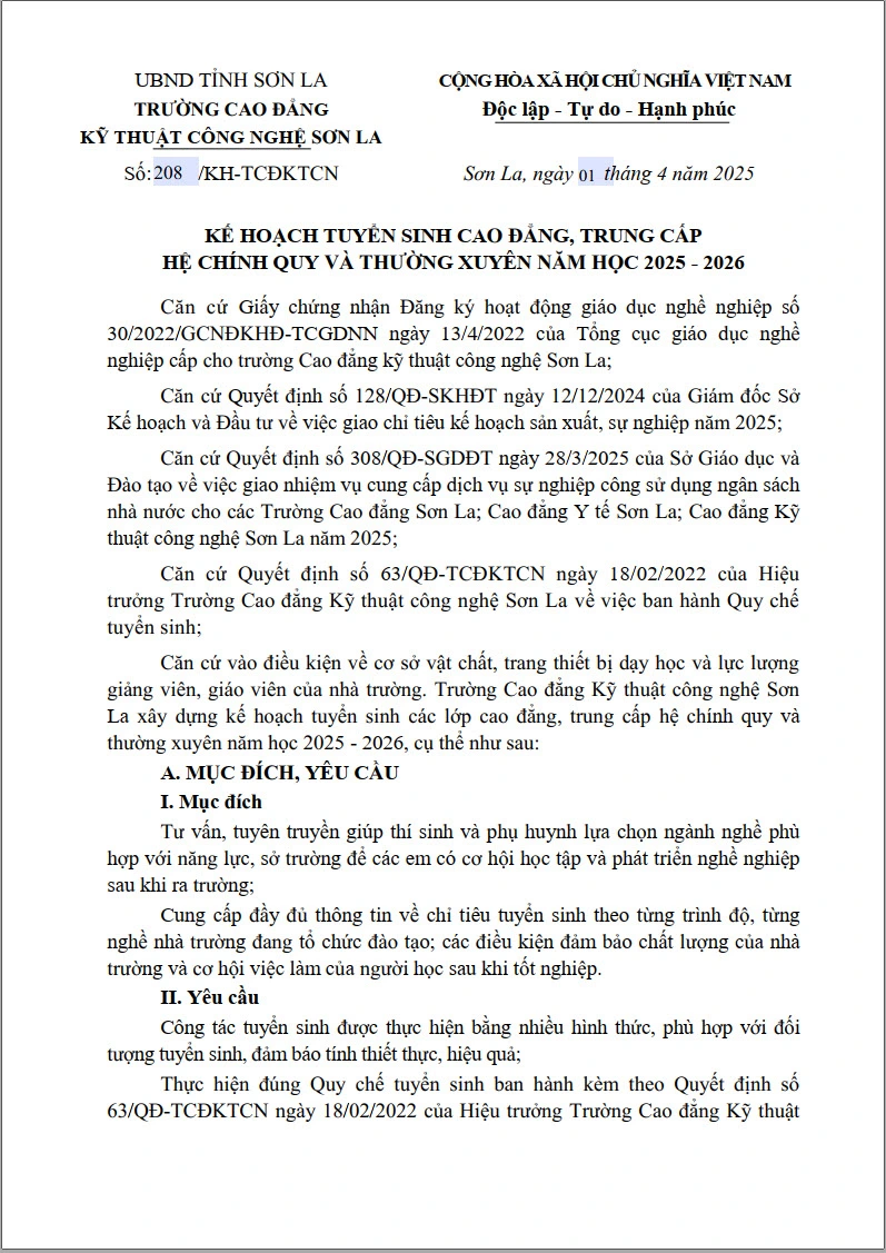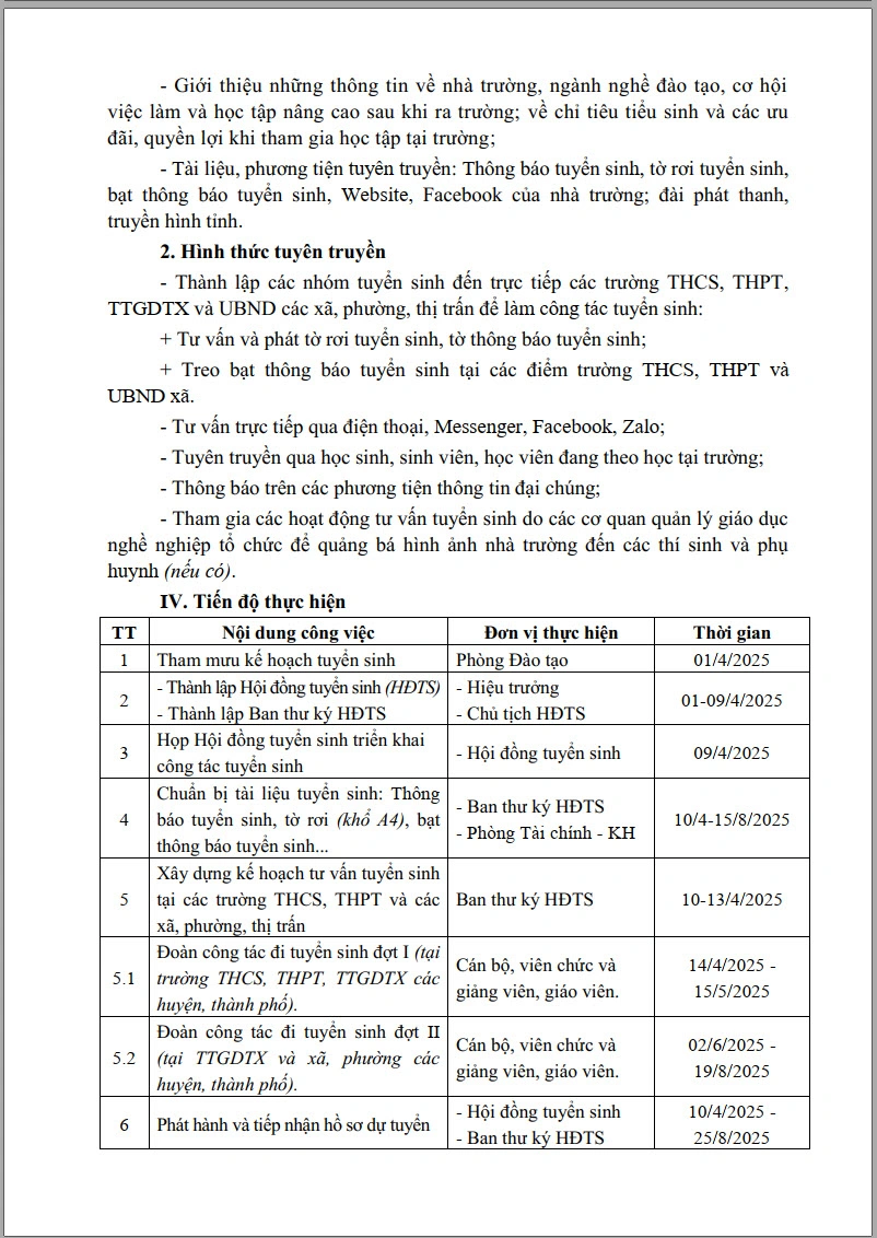 Kế hoạch tuyển sinh cao đẳng, trung cấp hệ chính quy và thường xuyên năm học 2025 - 2026