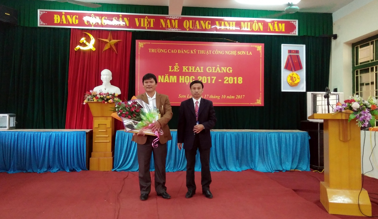Thừa ủy quyền của Chủ tịch UBND tỉnh Đ/c Nguyễn Quốc Quang – UVBCH Đảng bộ, Phó Hiệu trưởng tặng hoa và chuyển trao huy hiệu vì sự nghiệp Xây dựng và Phát triển Sơn La cho đồng chí Lê Trọng Sơn – Nhân viên phòng QTĐS