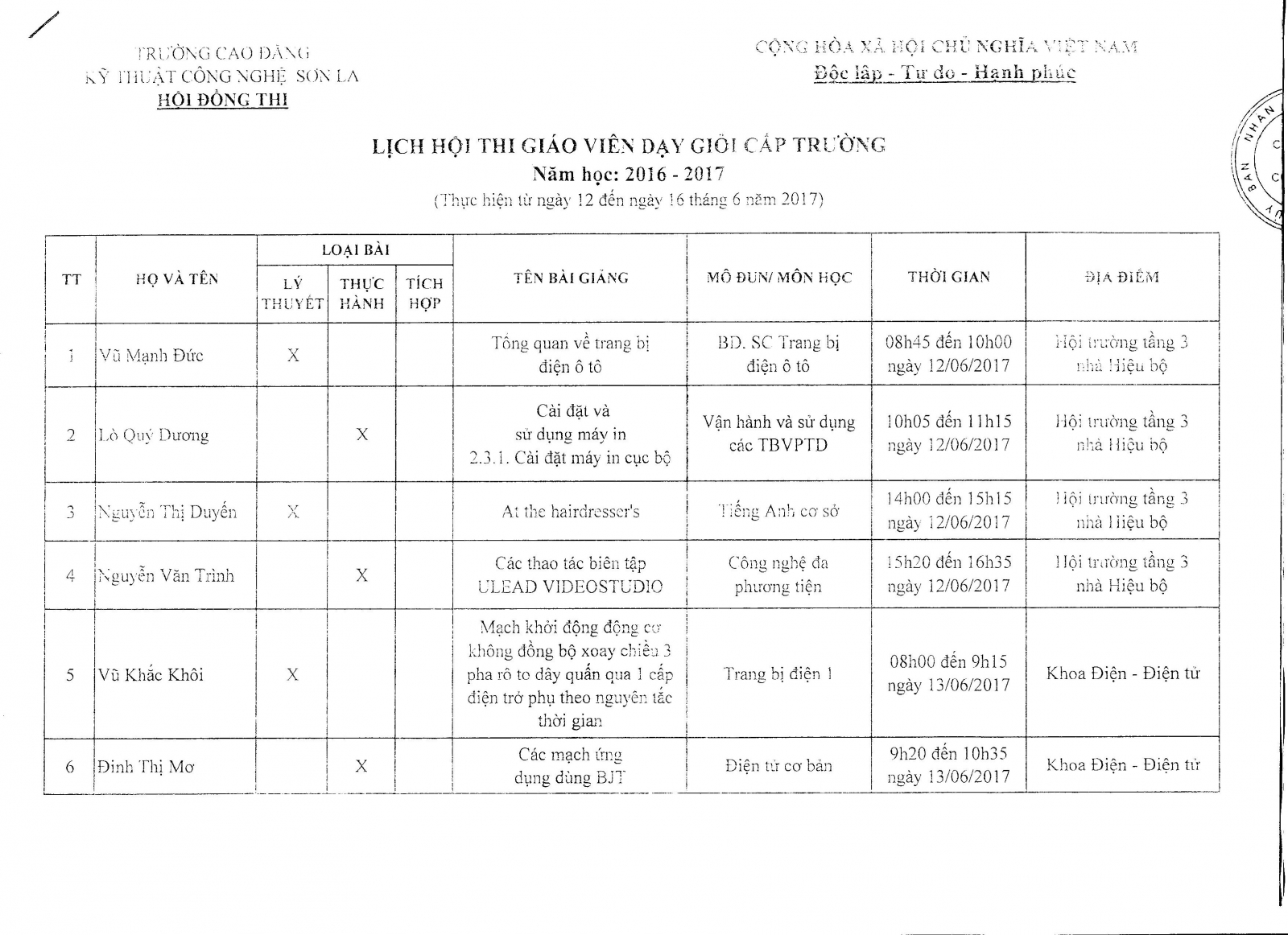 Lịch Hội thi Giáo viên dạy giỏi cấp trường năm học 2016 - 2017