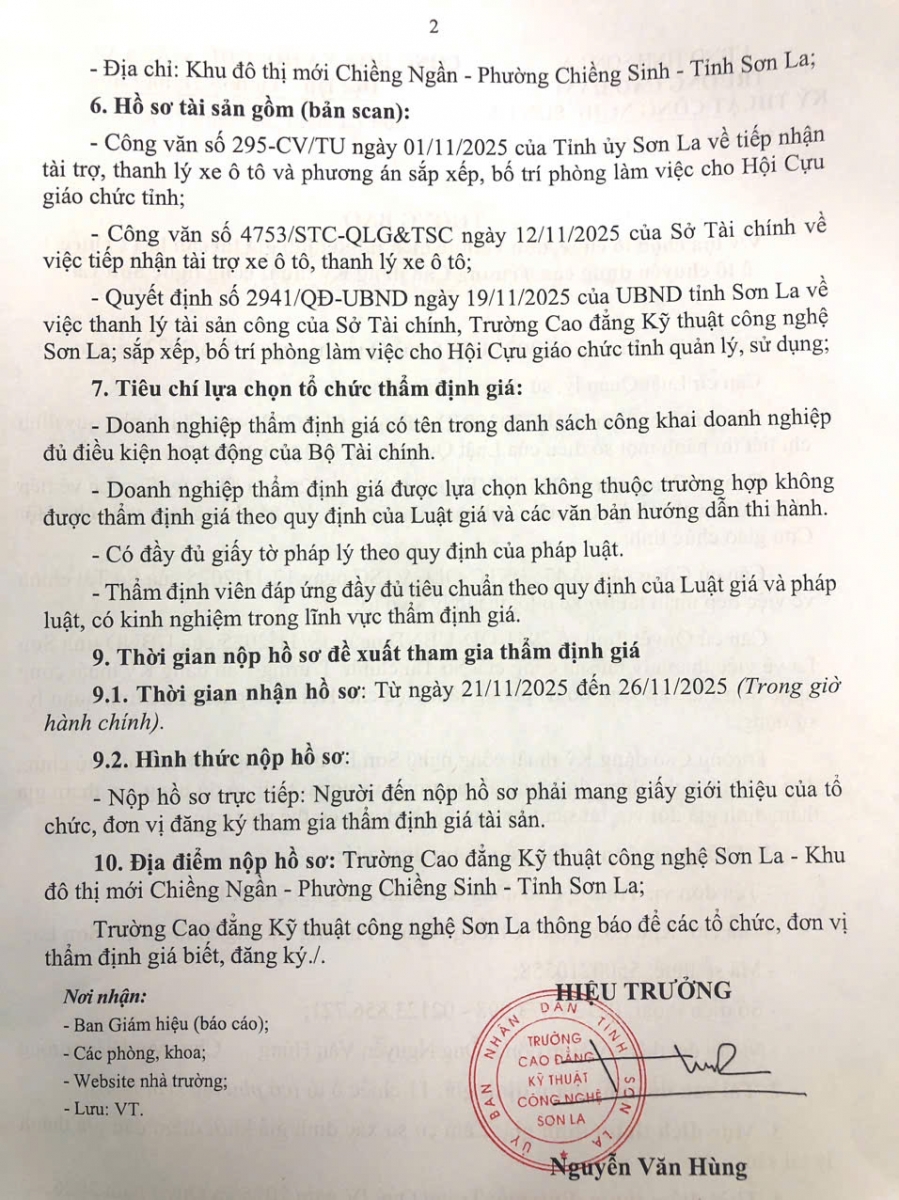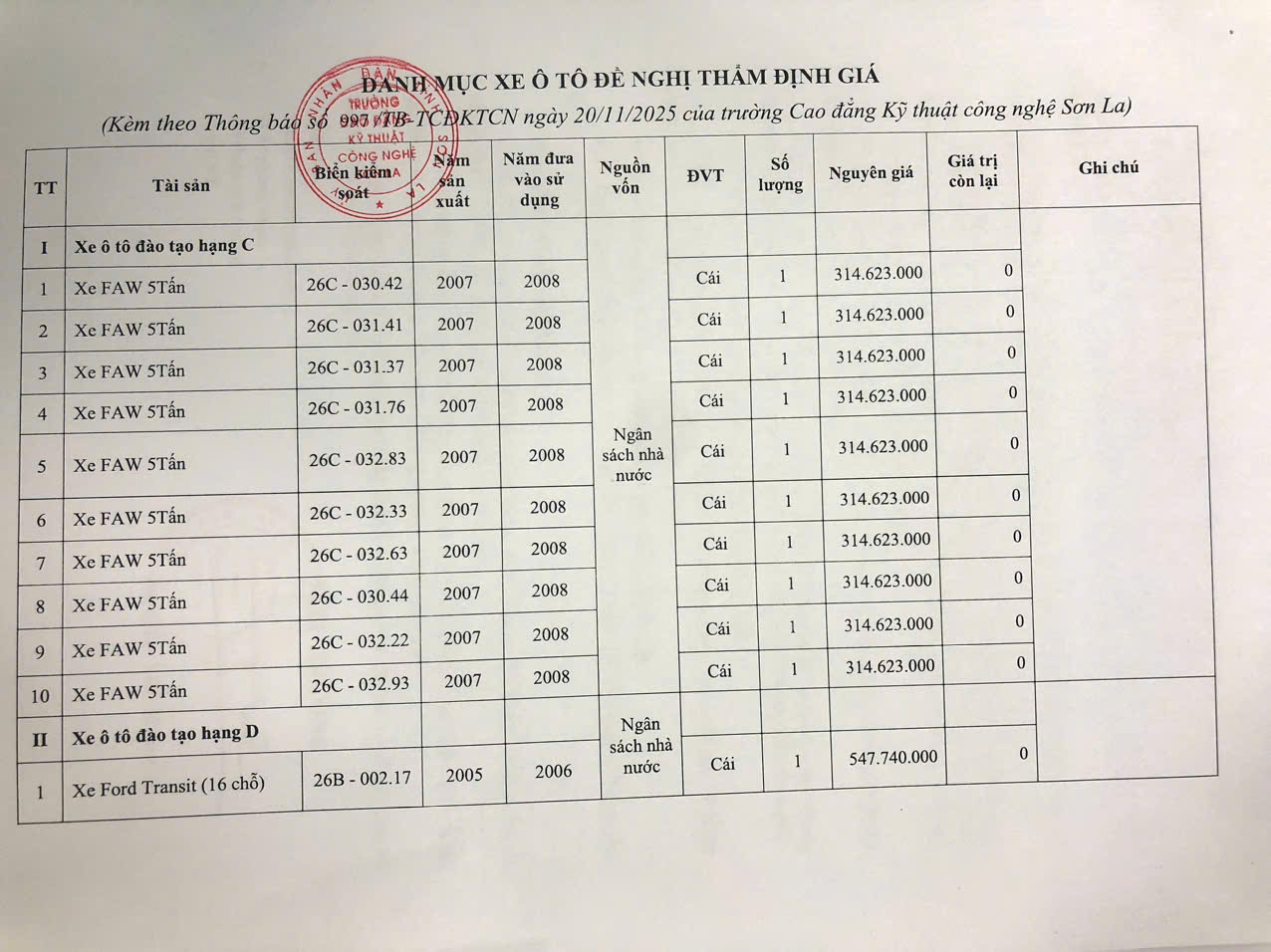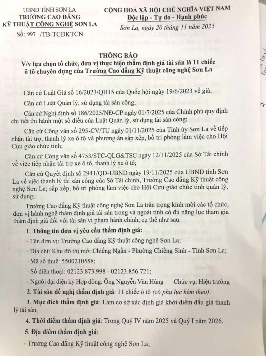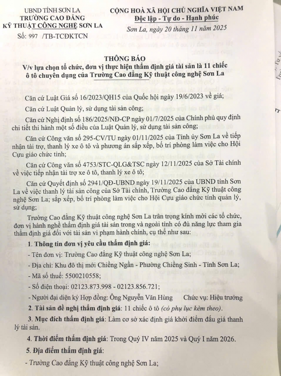 Thông báo số 997/TB-TCĐKTCN ngày 20/11/2025 về việc lựa chọn tổ chức, đơn vị thực hiện thẩm định giá tài sản là 11 chiếc ô tô chuyên dụng của Trường Cao đẳng Kỹ thuật công nghệ Sơn La