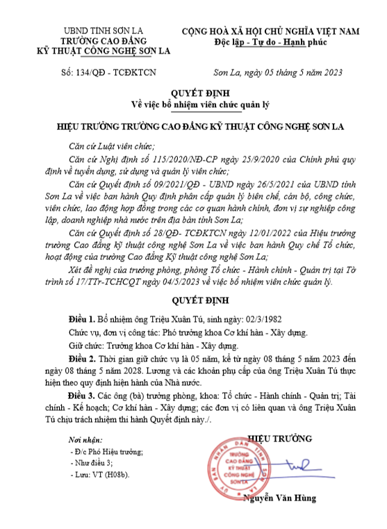Quyết định 134 về việc bổ nhiệm lại viên chức quản lý đối với ông Triệu Xuân Tú