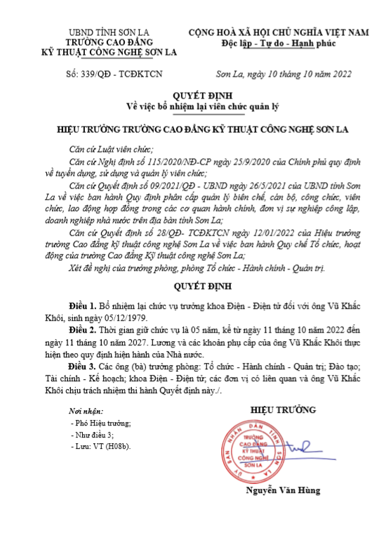 Quyết định 339 về bổ nhiệm lại viên chức quản lý đối với ông Vũ Khắc Khôi
