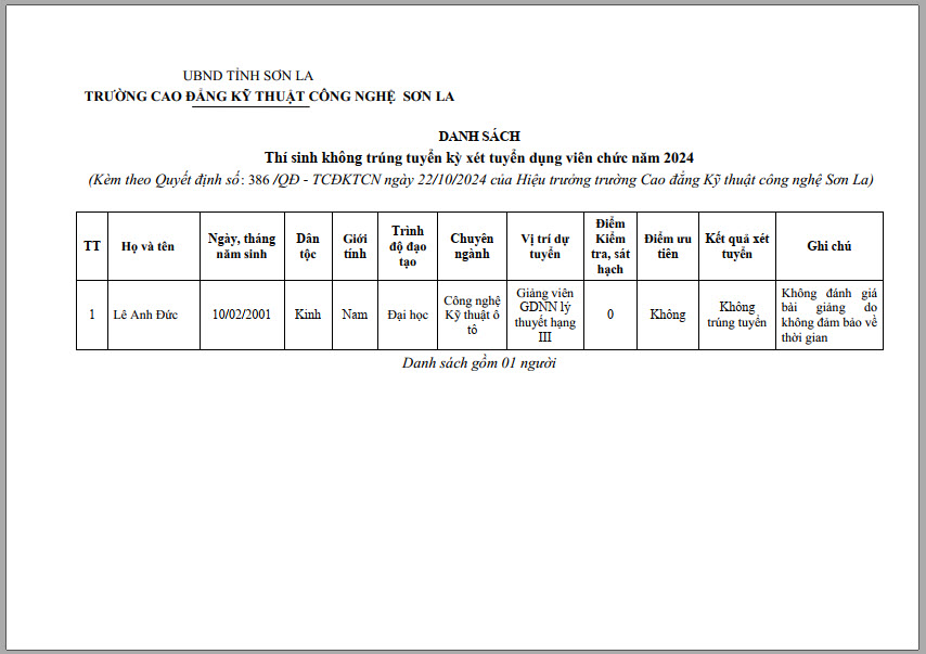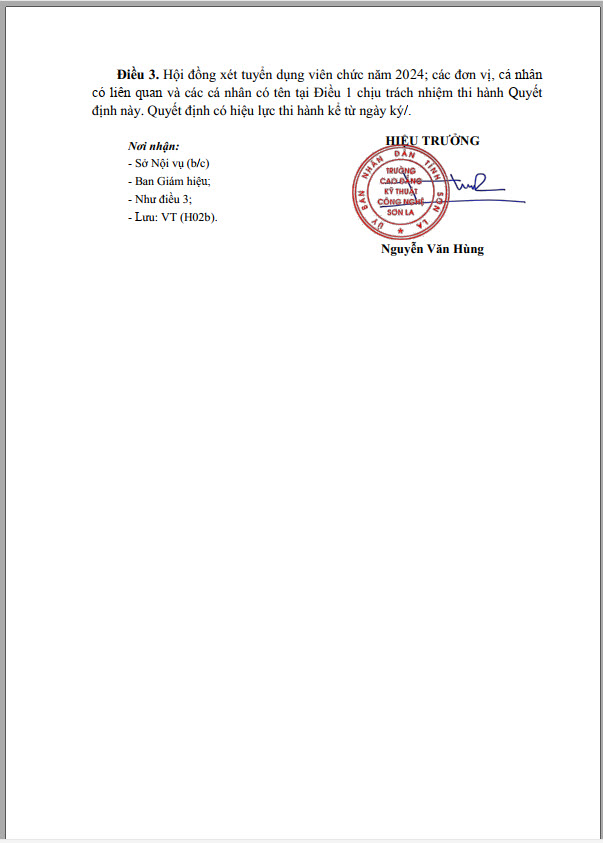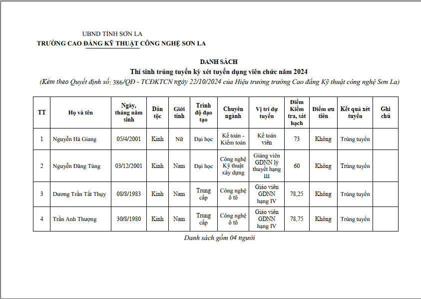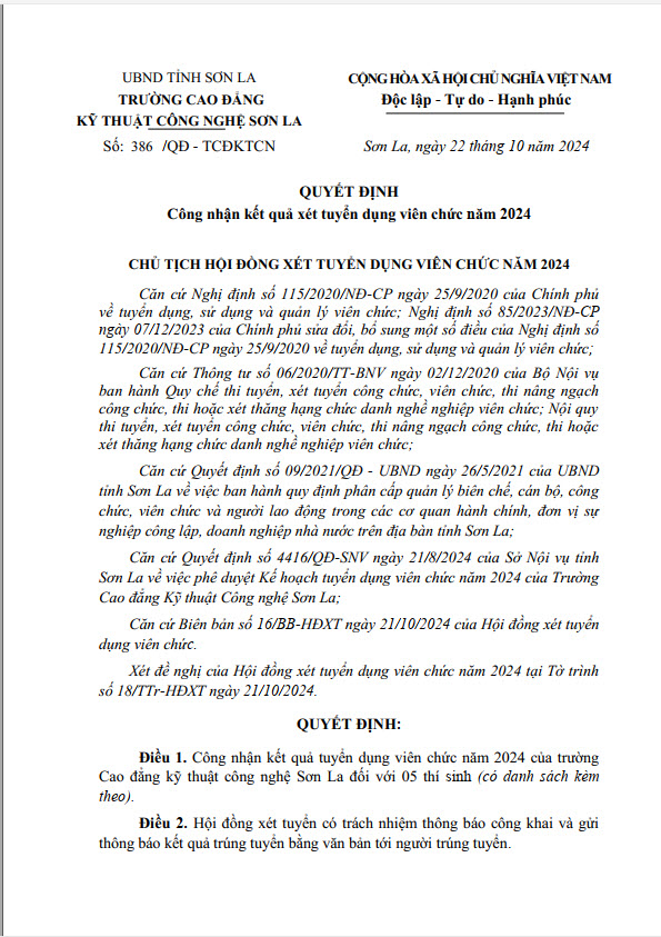 Quyết định công nhận kết quả xét tuyển dụng viên chức năm 2024