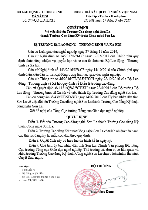 Quyết định đổi tên trường Cao đẳng Nghề Sơn La thành Trường Cao đẳng Kỹ thuật công nghệ Sơn La
