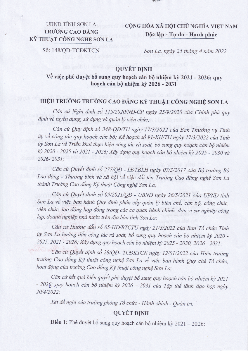 Quyết định số 148/QĐ-TCĐKTCN ngày 25/4/2022 về việc phê duyệt bổ sung quy hoạch cán bộ nhiệm kỳ 2021 - 2026; quy hoạch nhiệm kỳ 2026 - 2031