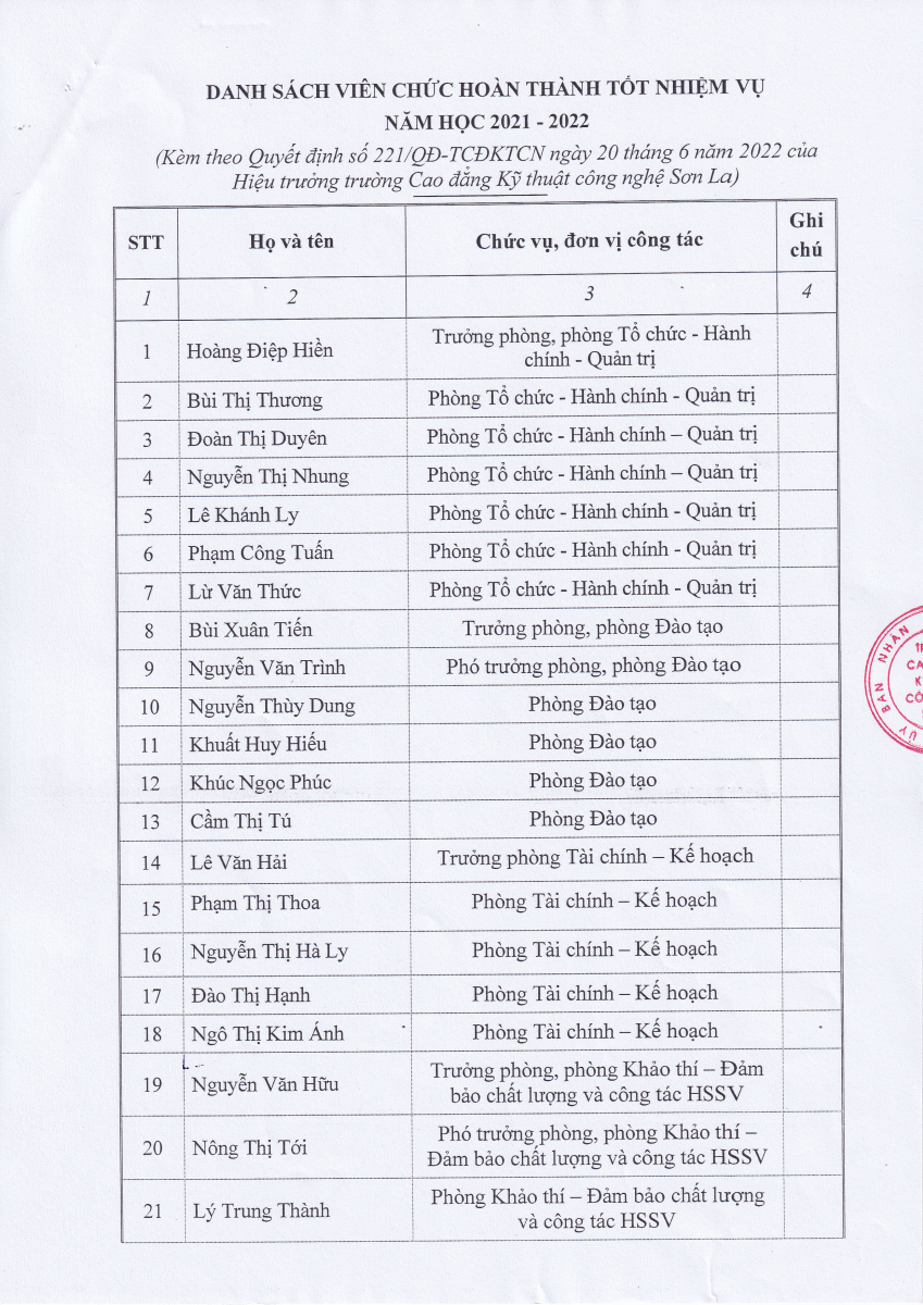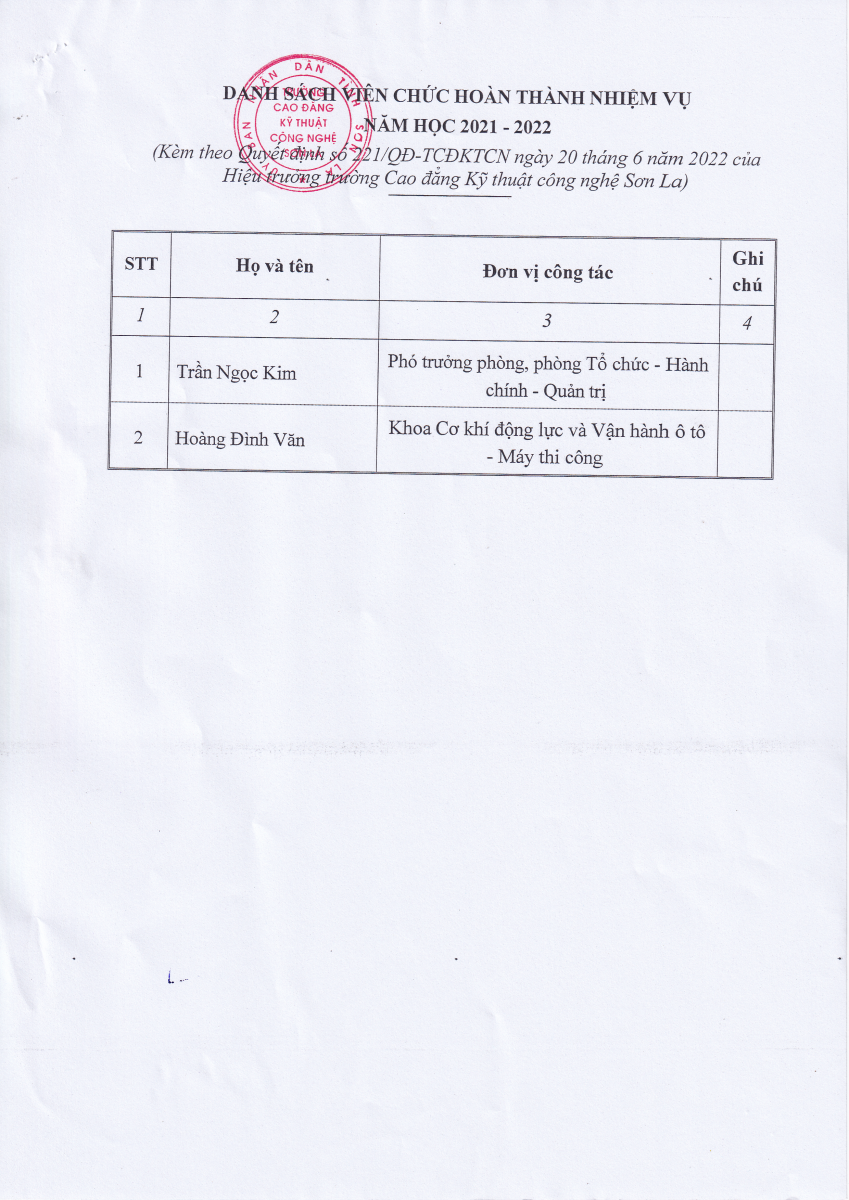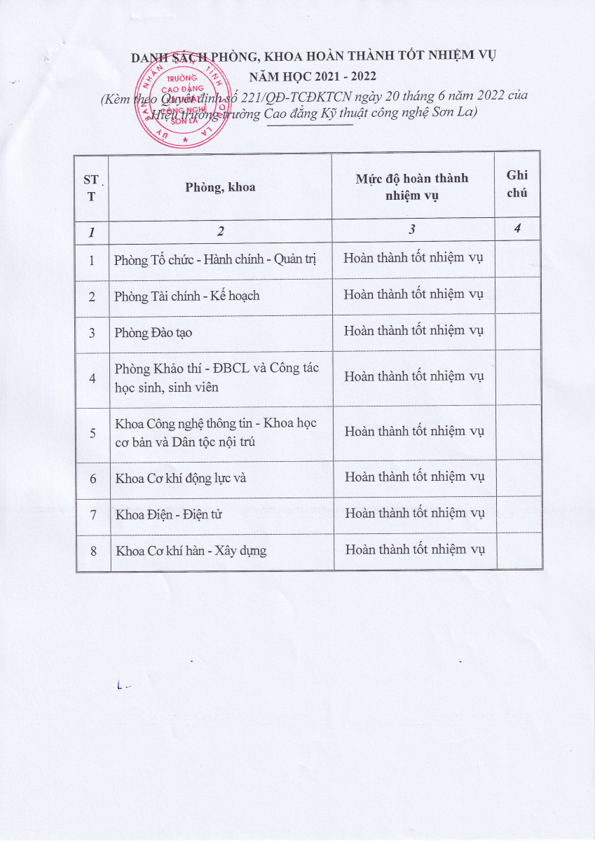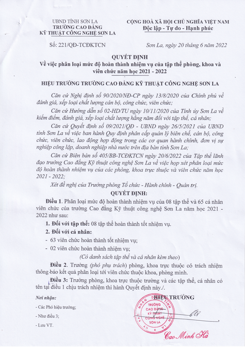 Quyết định số 221/QĐ-TCĐKTCN về việc phân loại mức độ hoàn thành nhiệm vụ của tập thể phòng, khoa và viên chức năm học 2021 - 2022