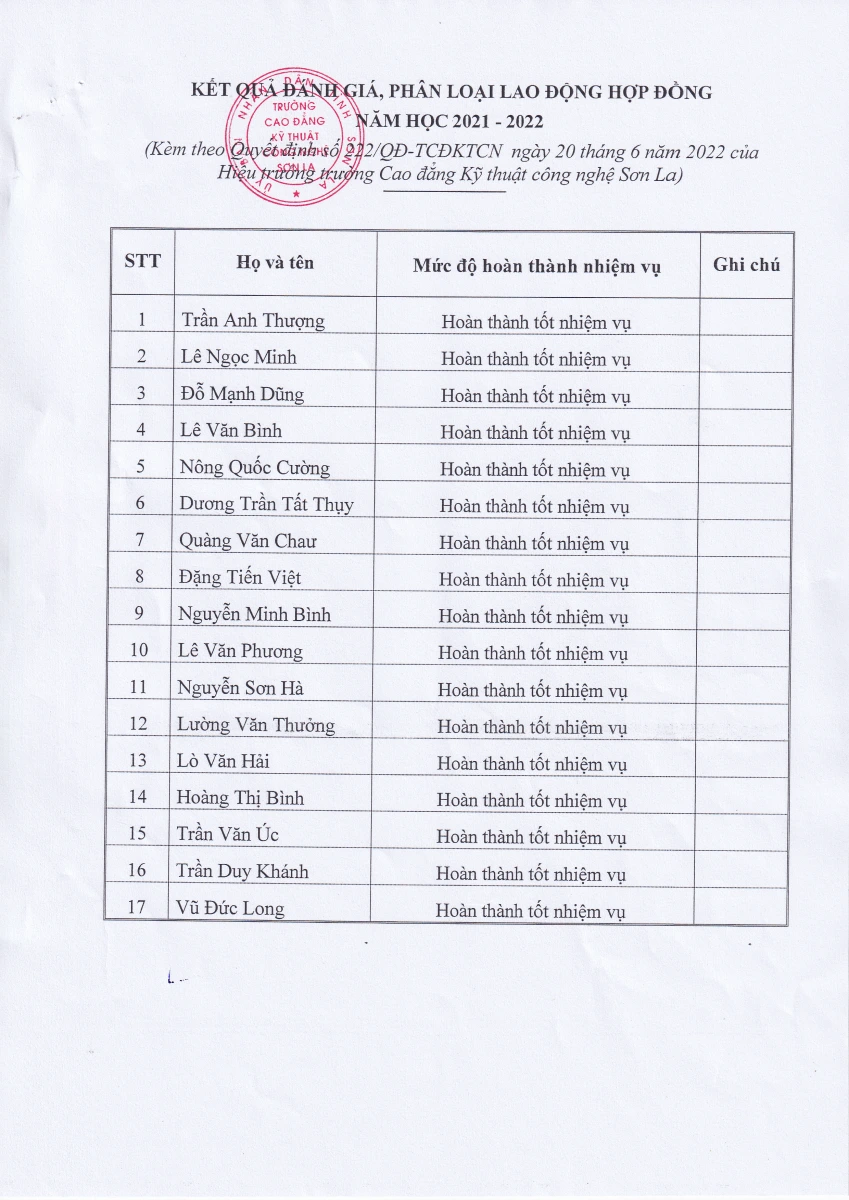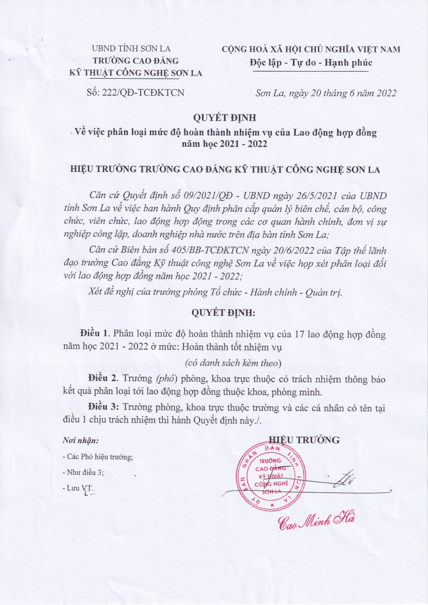Quyết định số 222/QĐ-TCĐKTCN về việc phân loại mức độ hoàn thành nhiệm vụ của lao động hợp đồng năm học 2021-2022