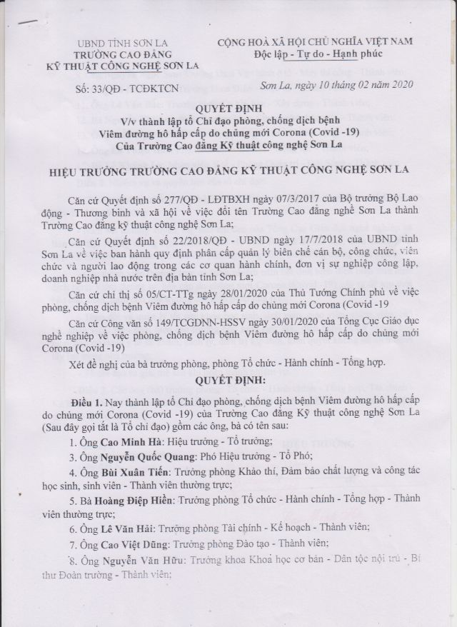 Quyết định thành lập tổ Chỉ đạo phòng, chống dịch bệnh viêm đường hô hấp cấp do chủng mới Corona (Covid -19)