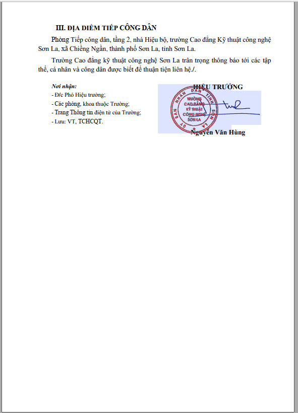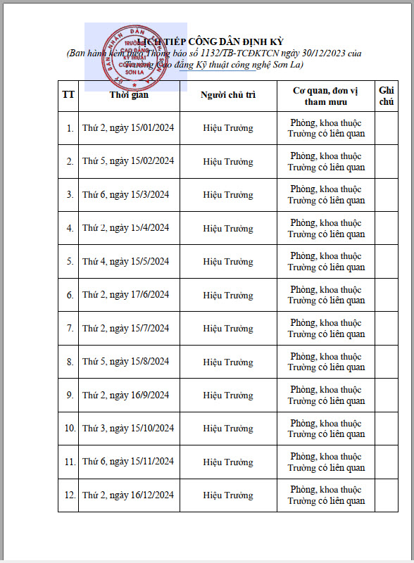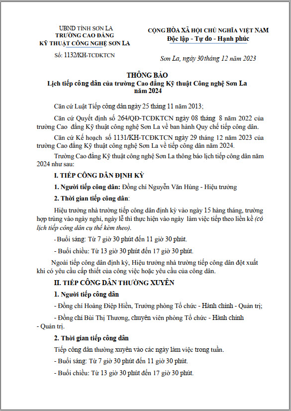 Thông báo 1132 lịch tiếp công dân của trường Cao đẳng Kỹ thuật công nghệ Sơn La