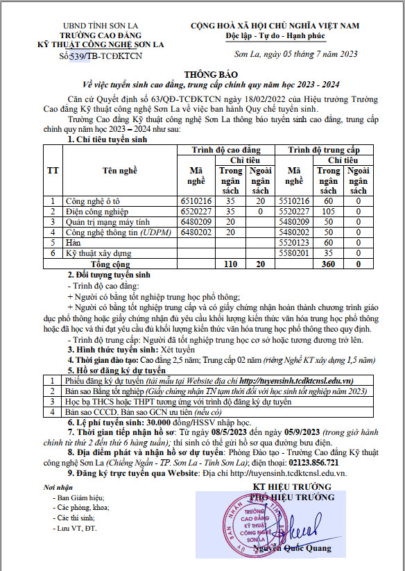 Thông báo 539 tuyển sinh cao đẳng, trung cấp chính quy năm học 2023 -2024