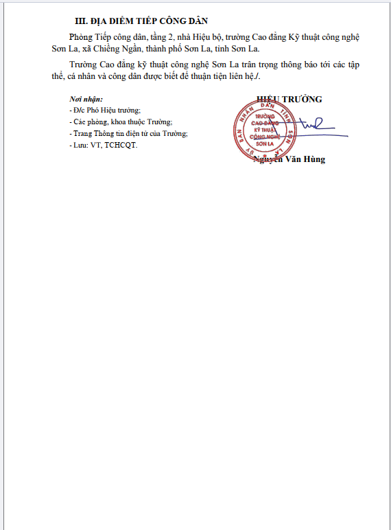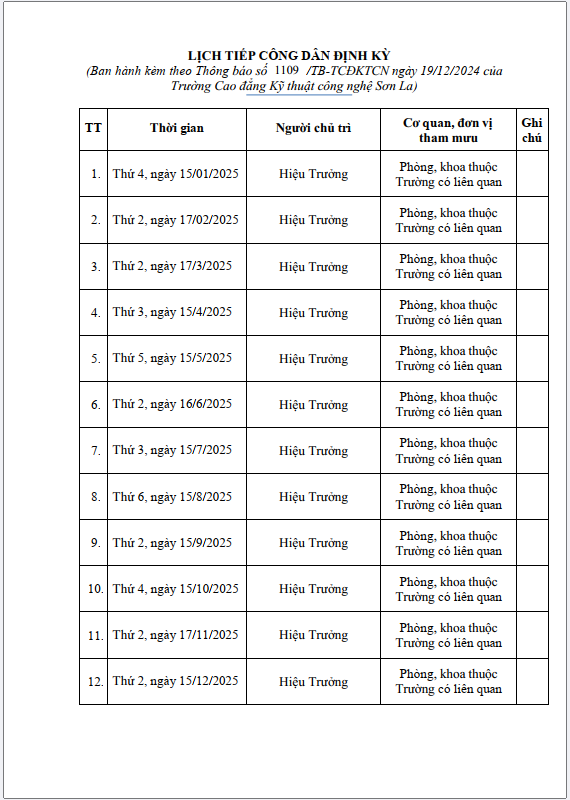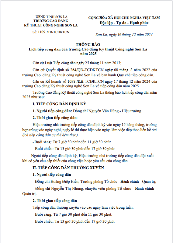 Thông báo lịch tiếp công dân của Trường Cao đẳng Kỹ thuật công nghệ Sơn La năm 2025