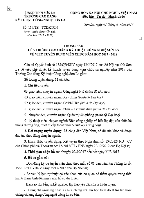 Thông báo tuyển dụng viên chức năm học 2017 - 2018