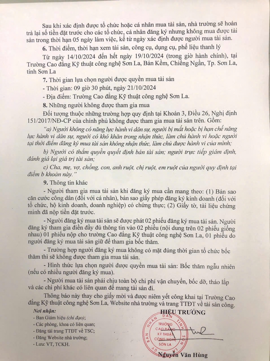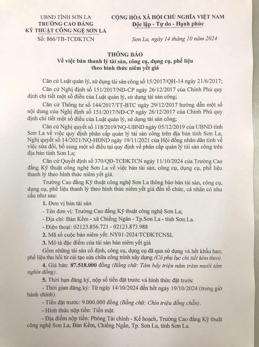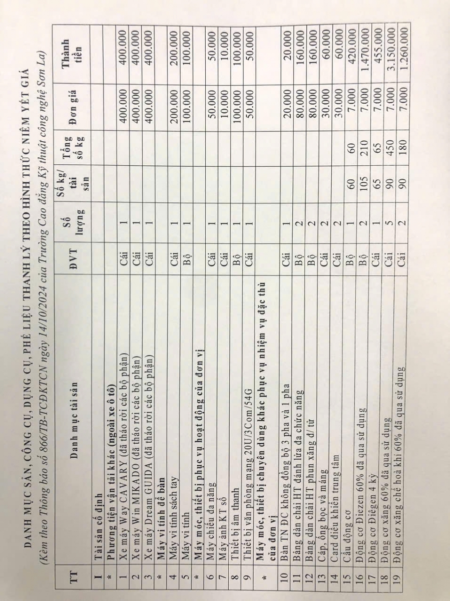 Thông báo Về việc lựa chọn tổ chức, đơn vị thực hiện thẩm định giá tài sản hư hỏng, hết khấu hao sử dụng của Trường Cao đẳng Kỹ thuật công nghệ Sơn La