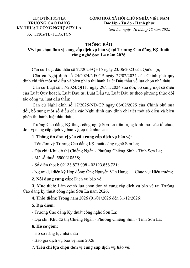 Thông báo về việc lựa chọn đơn vị cung cấp dịch vụ bảo vệ tại trường Cao đẳng Kỹ thuật công nghệ năm 2026