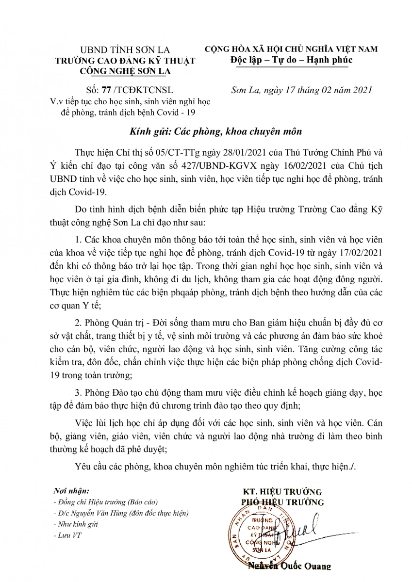 Thông báo về việc tiếp tục cho học sinh, sinh viên và học viên nghỉ học phòng tránh dịch bênh Covi-19