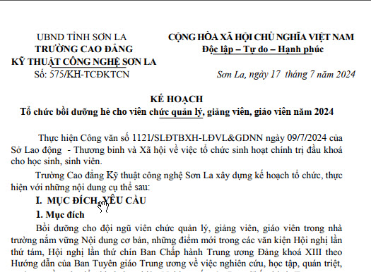 Ngày 28/6/2024, Trường Cao kỹ thuật công nghệ Sơn La tổ chức “Hội nghị Tổng kết năm học và Đối thoại trực tiếp giữa Hiệu trưởng với viên chức, người lao động năm học 2023 - 2024”