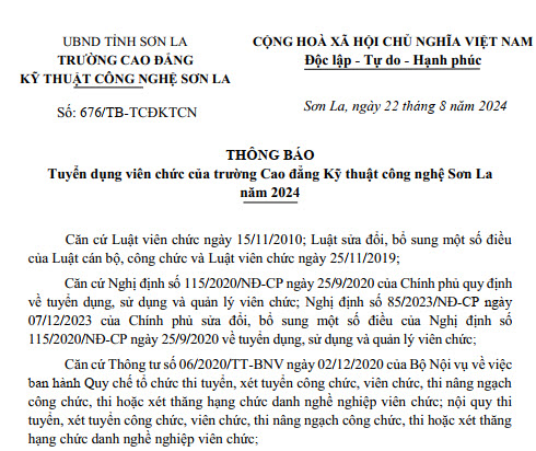 Quyết định số 1683 về việc giao cơ cấu ngạch, mã số, hạng chức danh nghề nghiệp trường Cao đẳng Kỹ thuật công nghệ Sơn La theo vị trí việc làm năm 2024