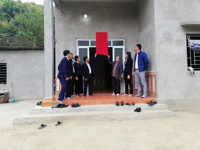 Đ/c Nguyễn Quốc Quang, phó Hiệu trưởng trường CĐKTCN Sơn La và Đ/c Thào A Mua, phó Chủ tịch UBND huyện Bắc Yên tháo băng khánh thành nhà Đại đoàn kết cho gia đình ông Đinh Văn Liệu, cư trú tại bản Pe, xã Song Pe
